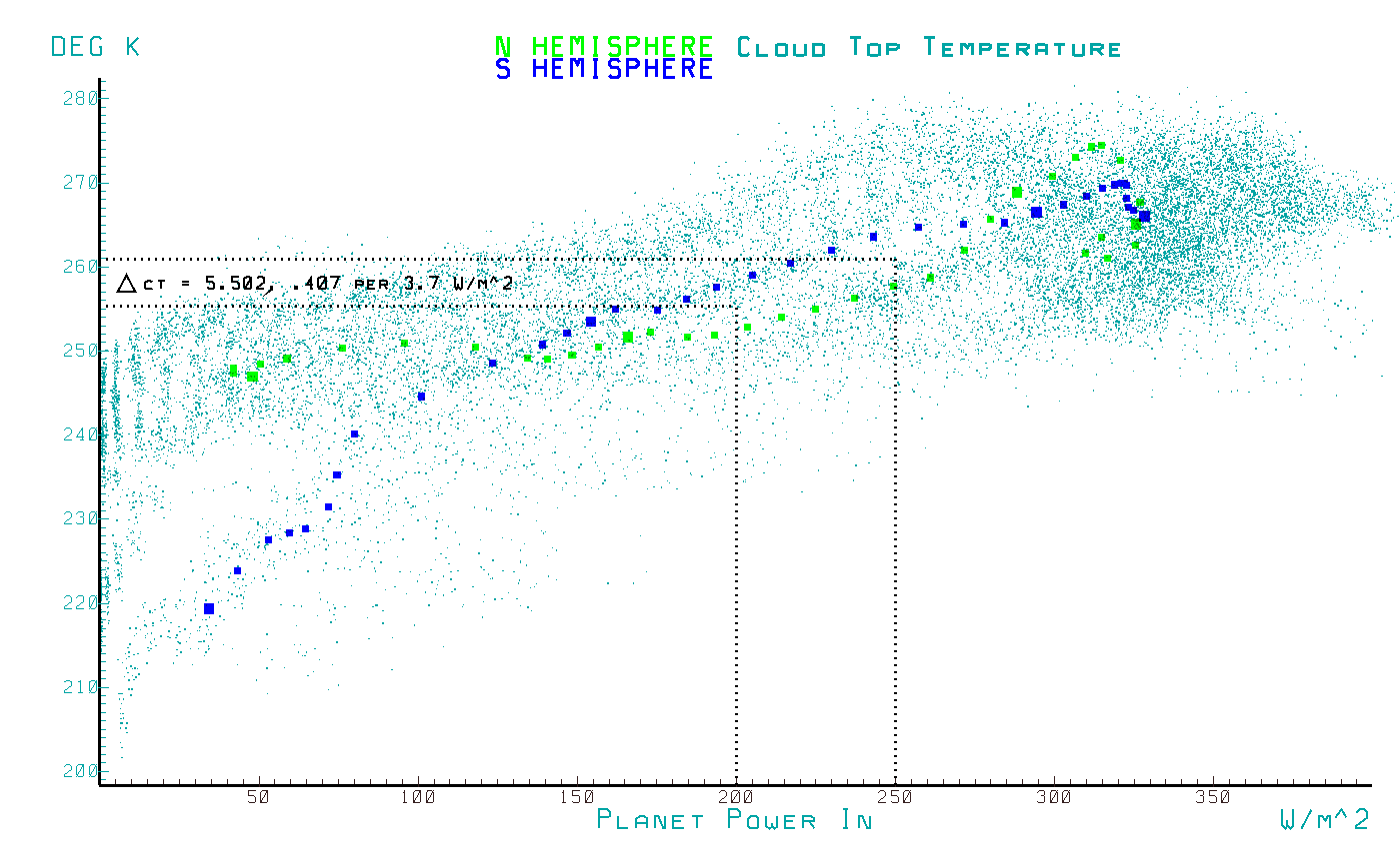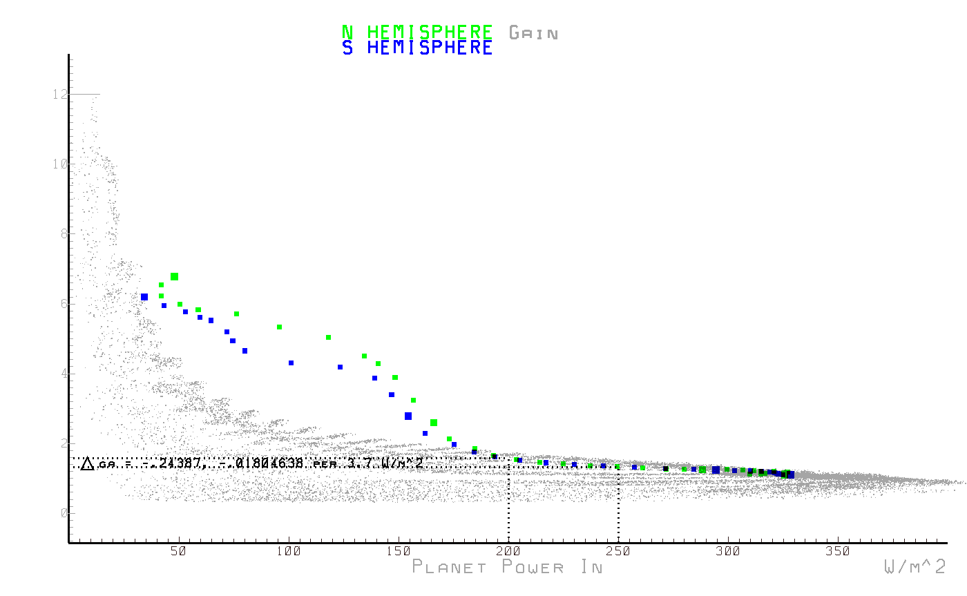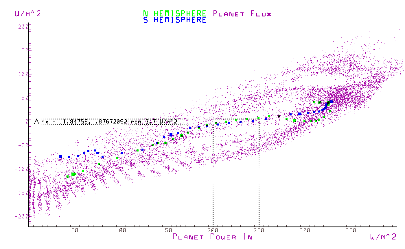 These are plots of several climate variables vs. the planet power input (the post albedo incident power). The different variables plotted against PI are,