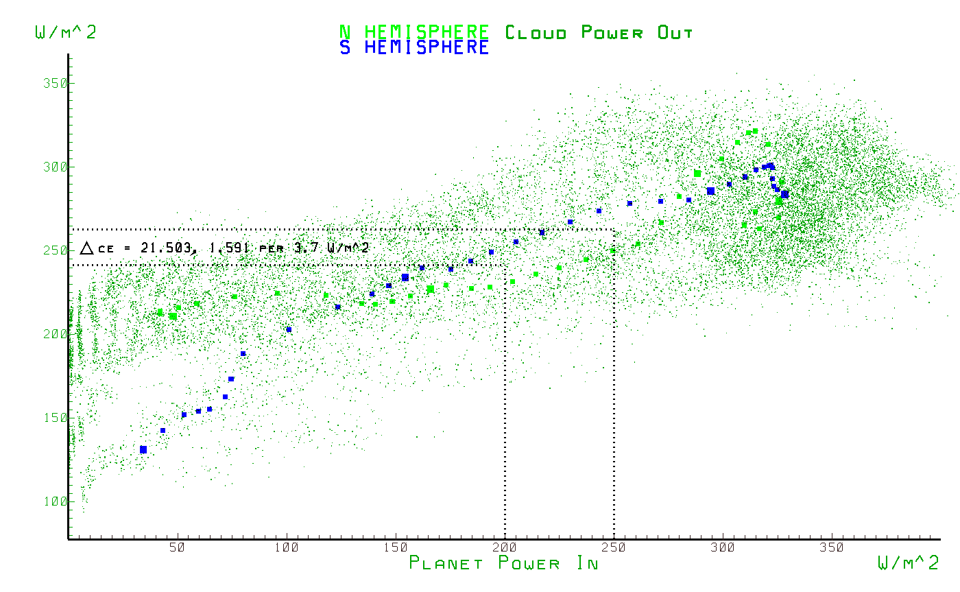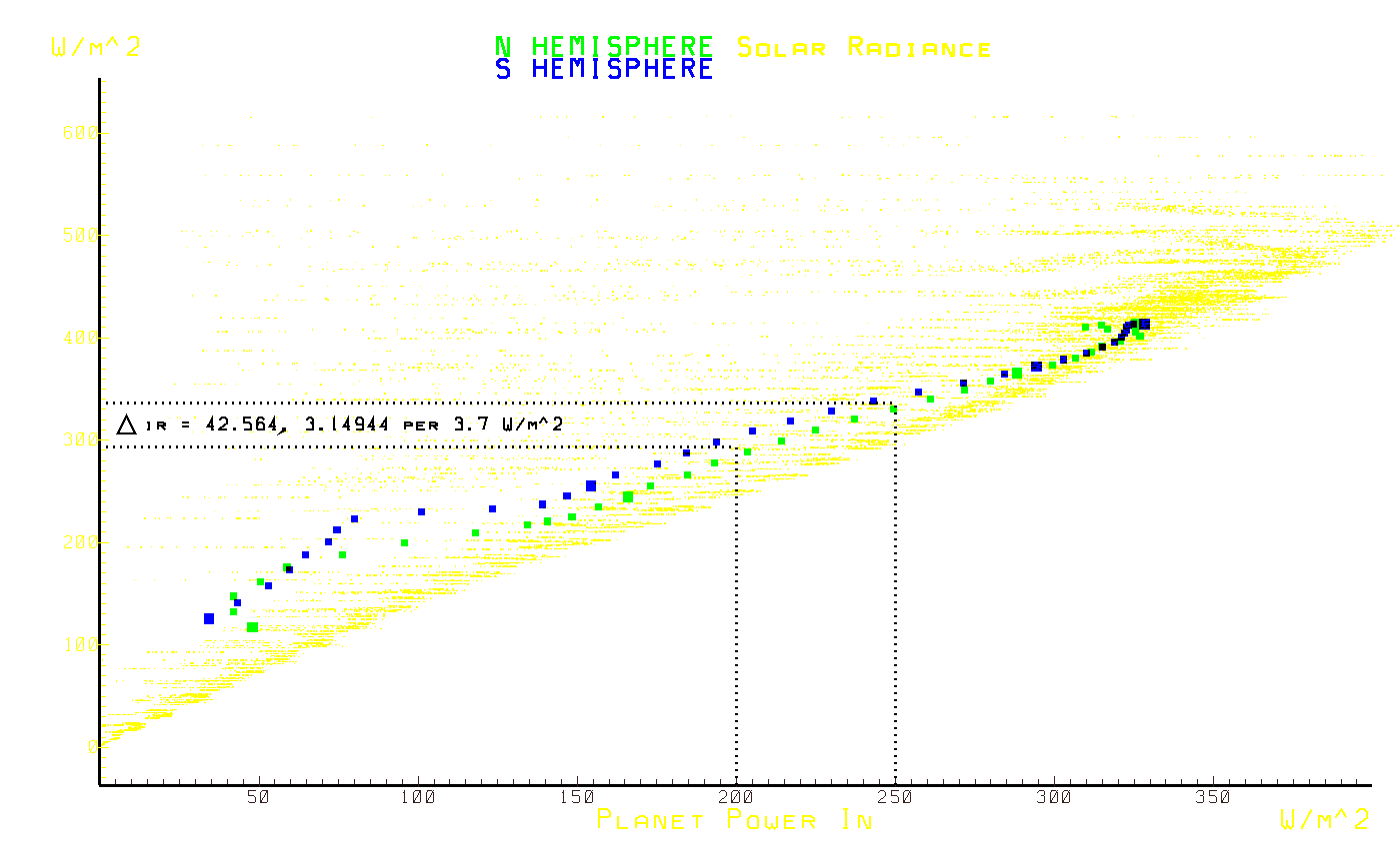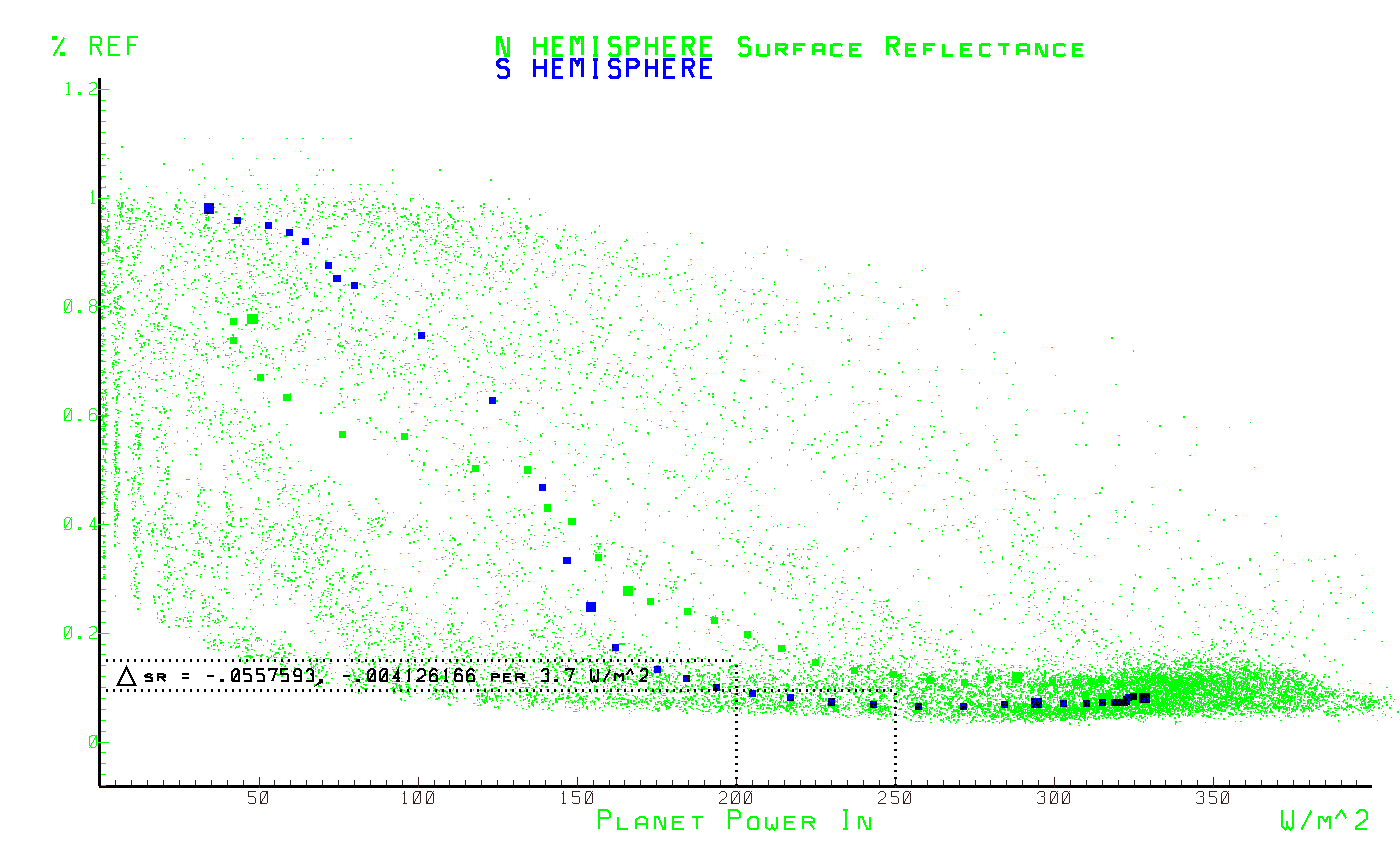 These are plots of several climate variables vs. the planet power input (the post albedo incident power). The different variables plotted against PI are,