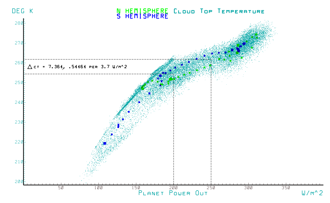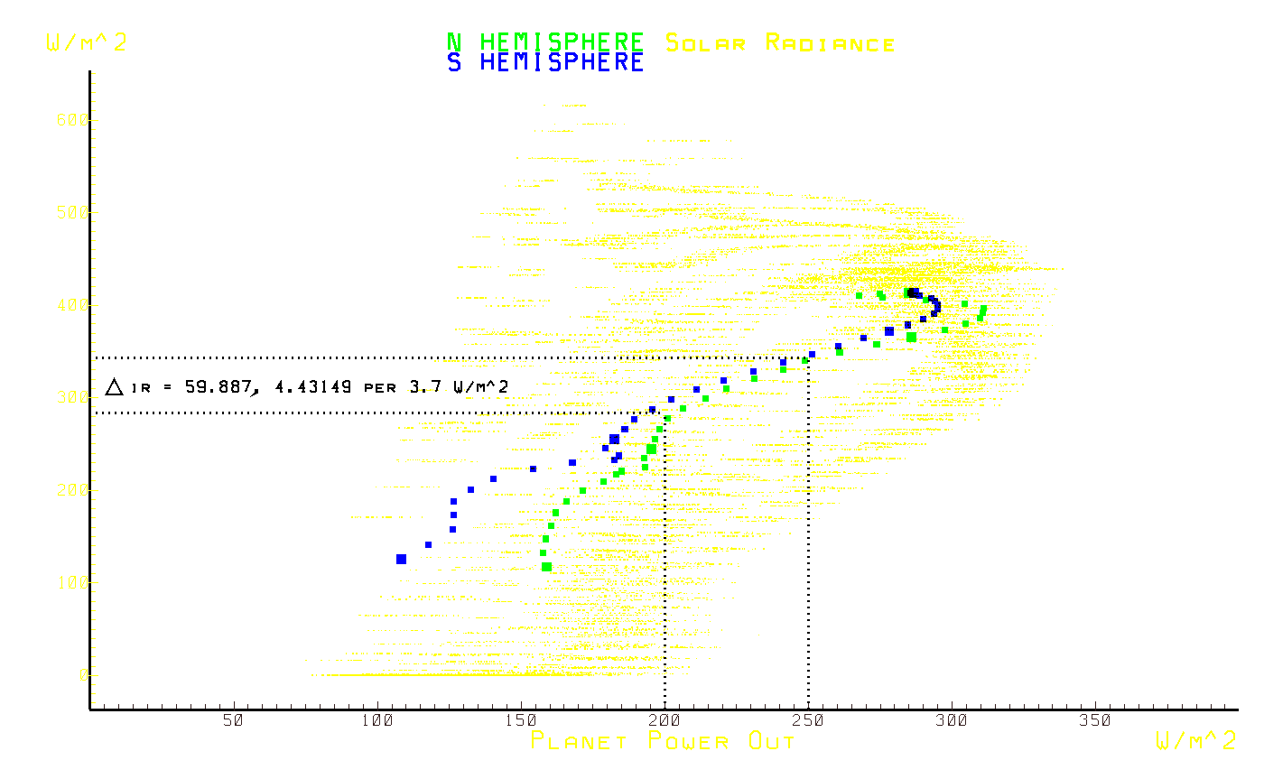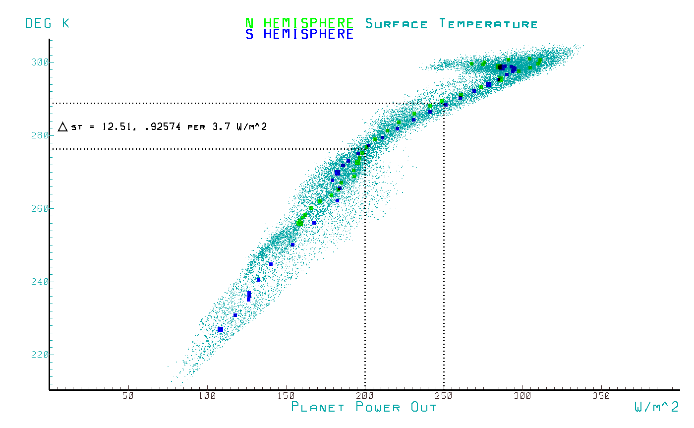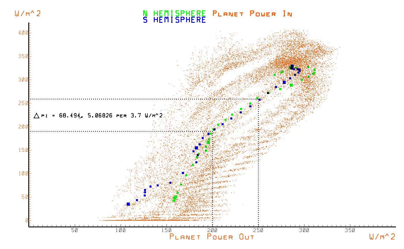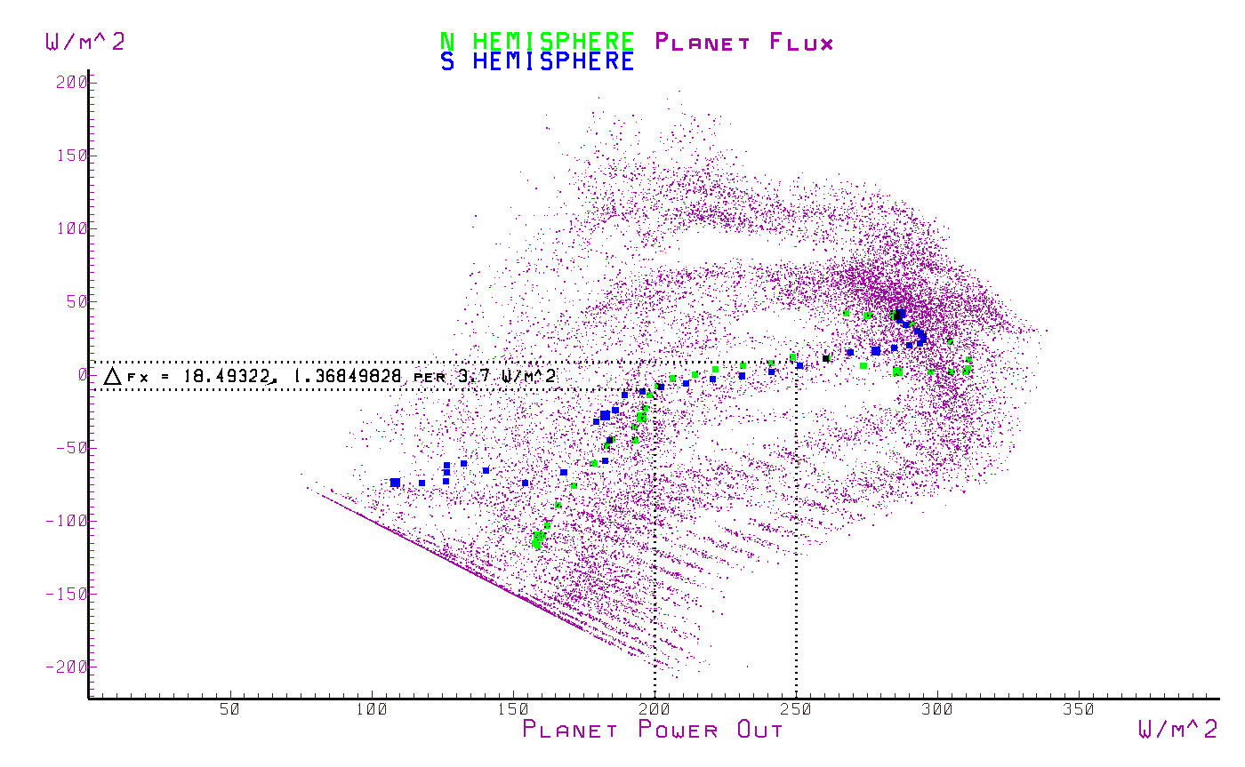 These are plots of several climate variables vs. the planet power output (the total emissions leaving the planet). The different variables plotted against PO are,
