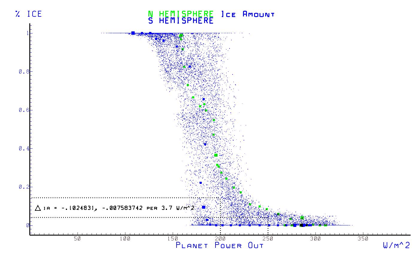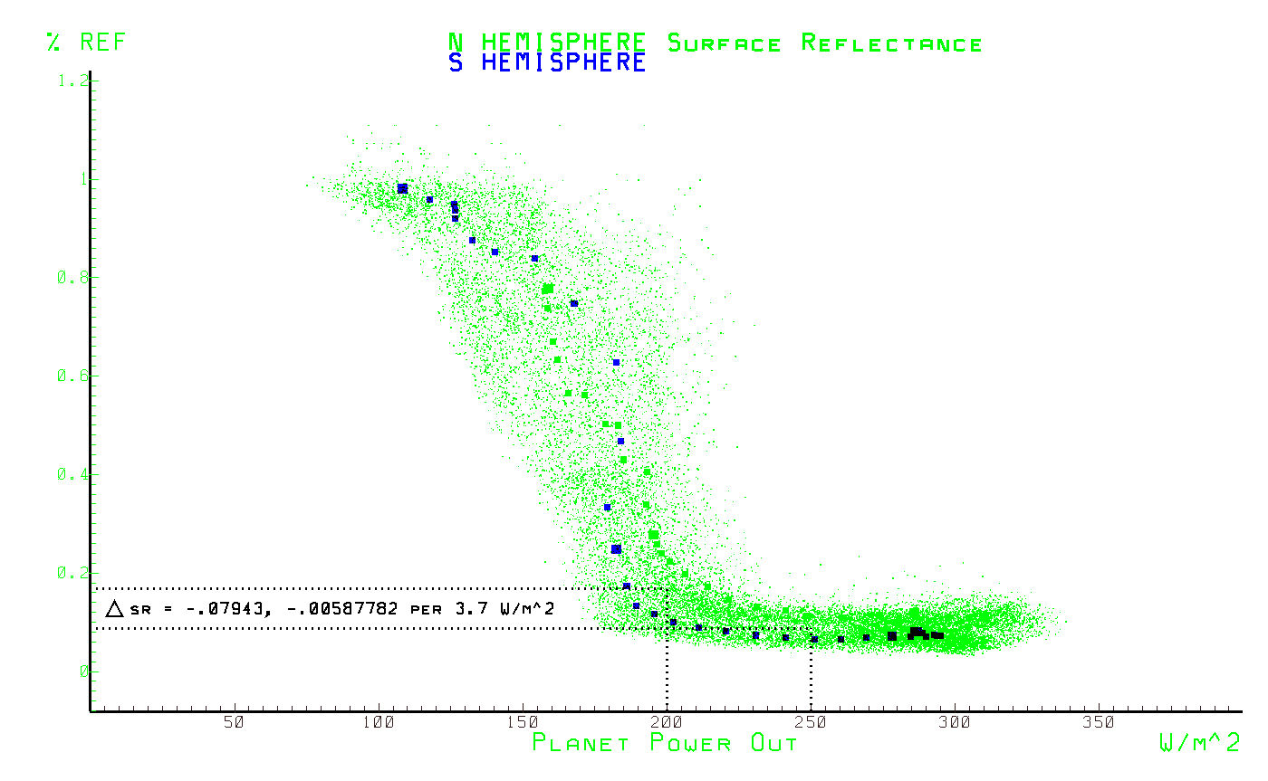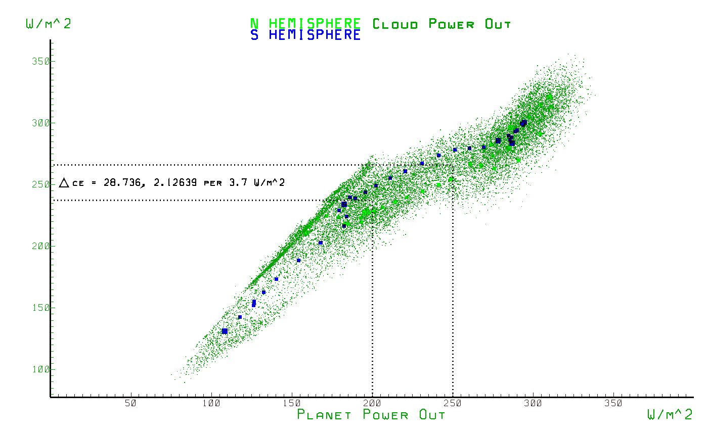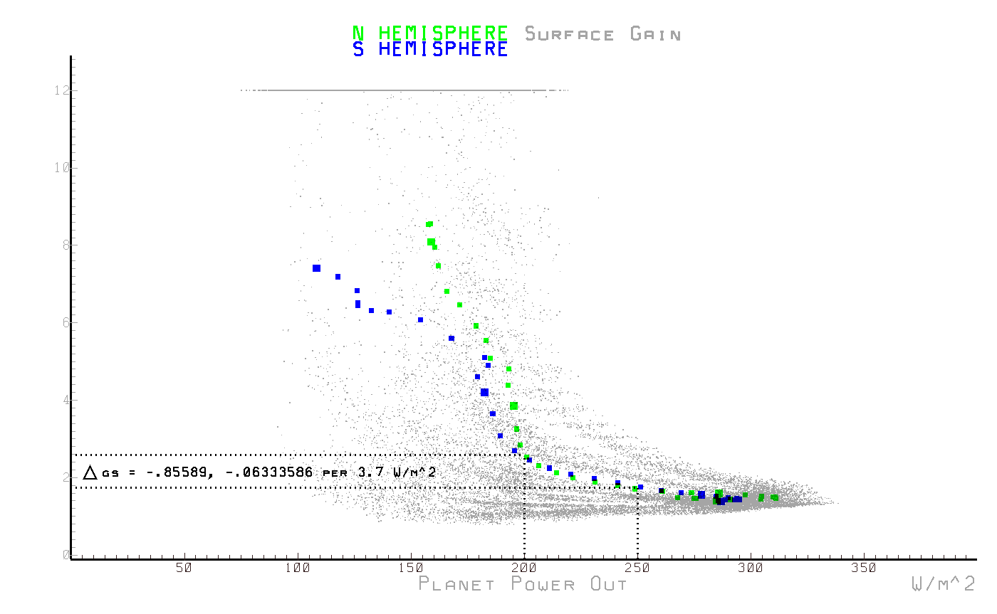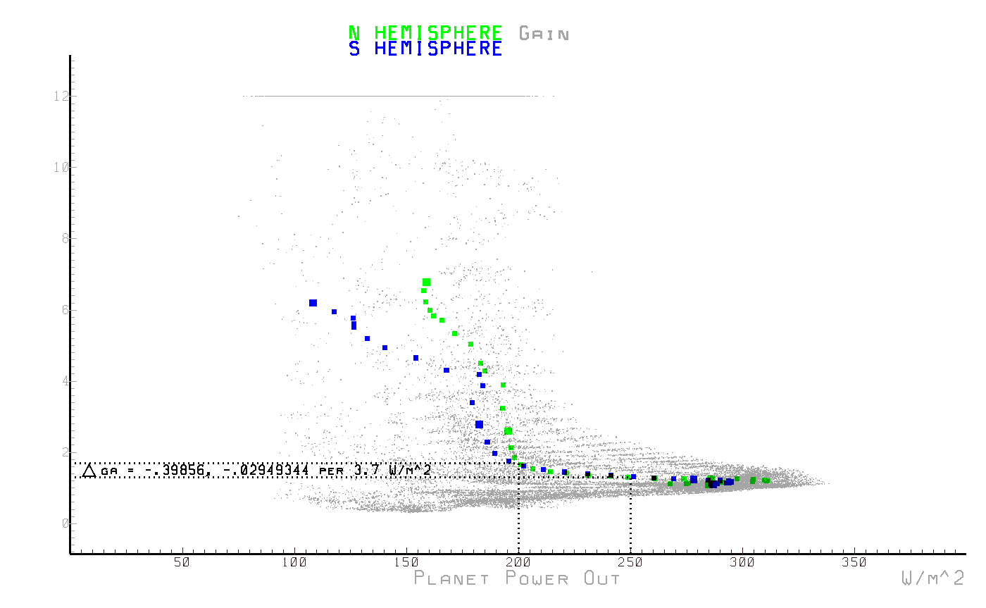 These are plots of several climate variables vs. the planet power output (the total emissions leaving the planet). The different variables plotted against PO are,