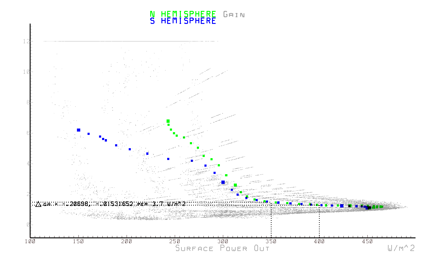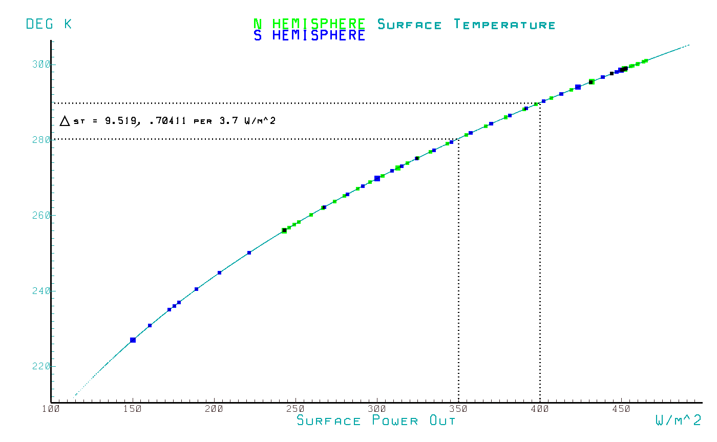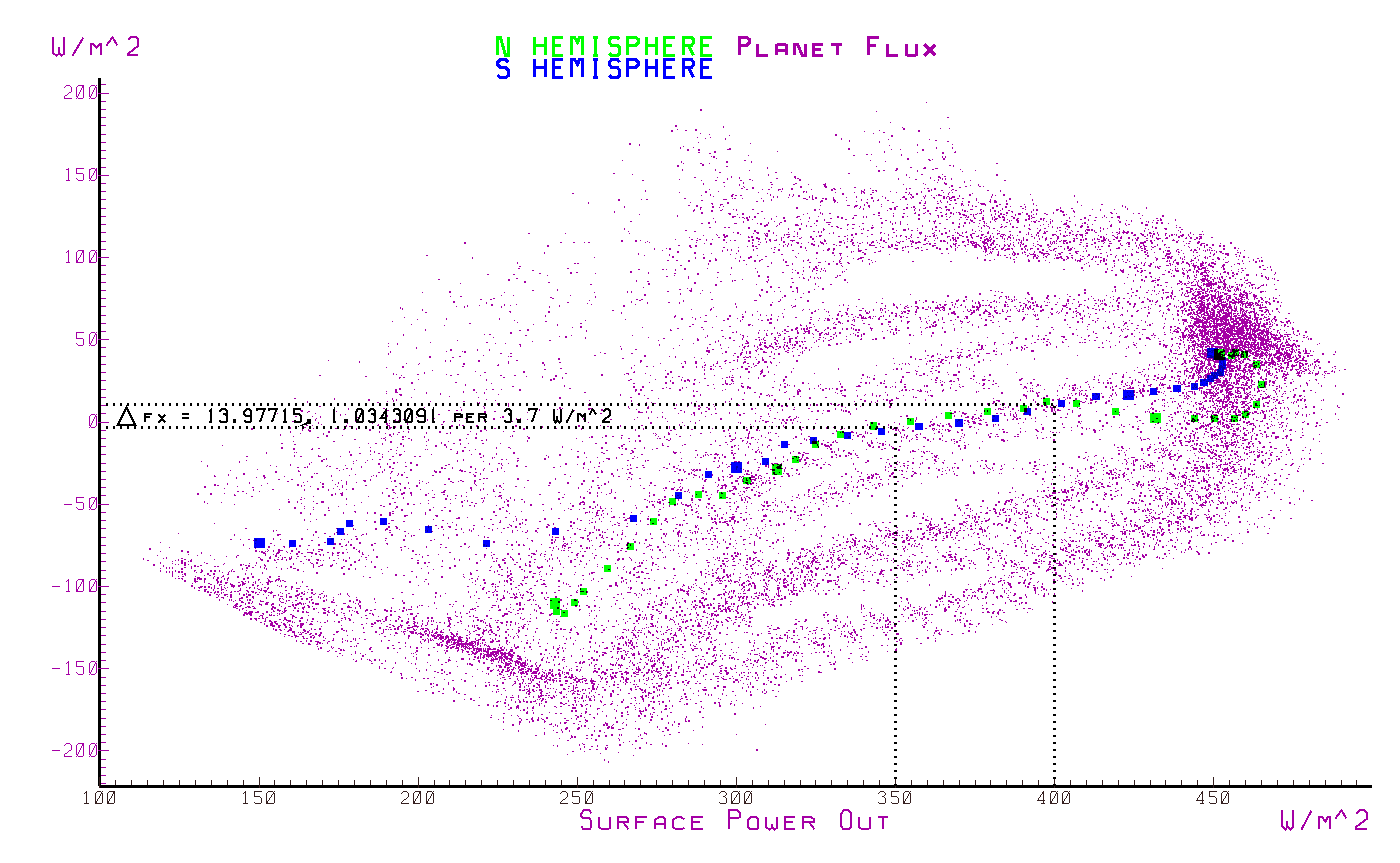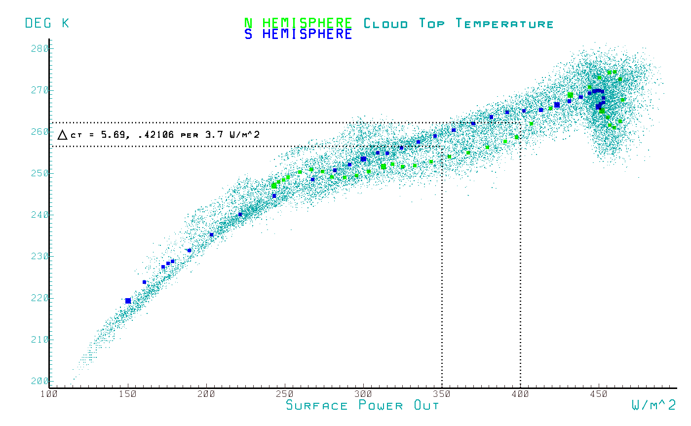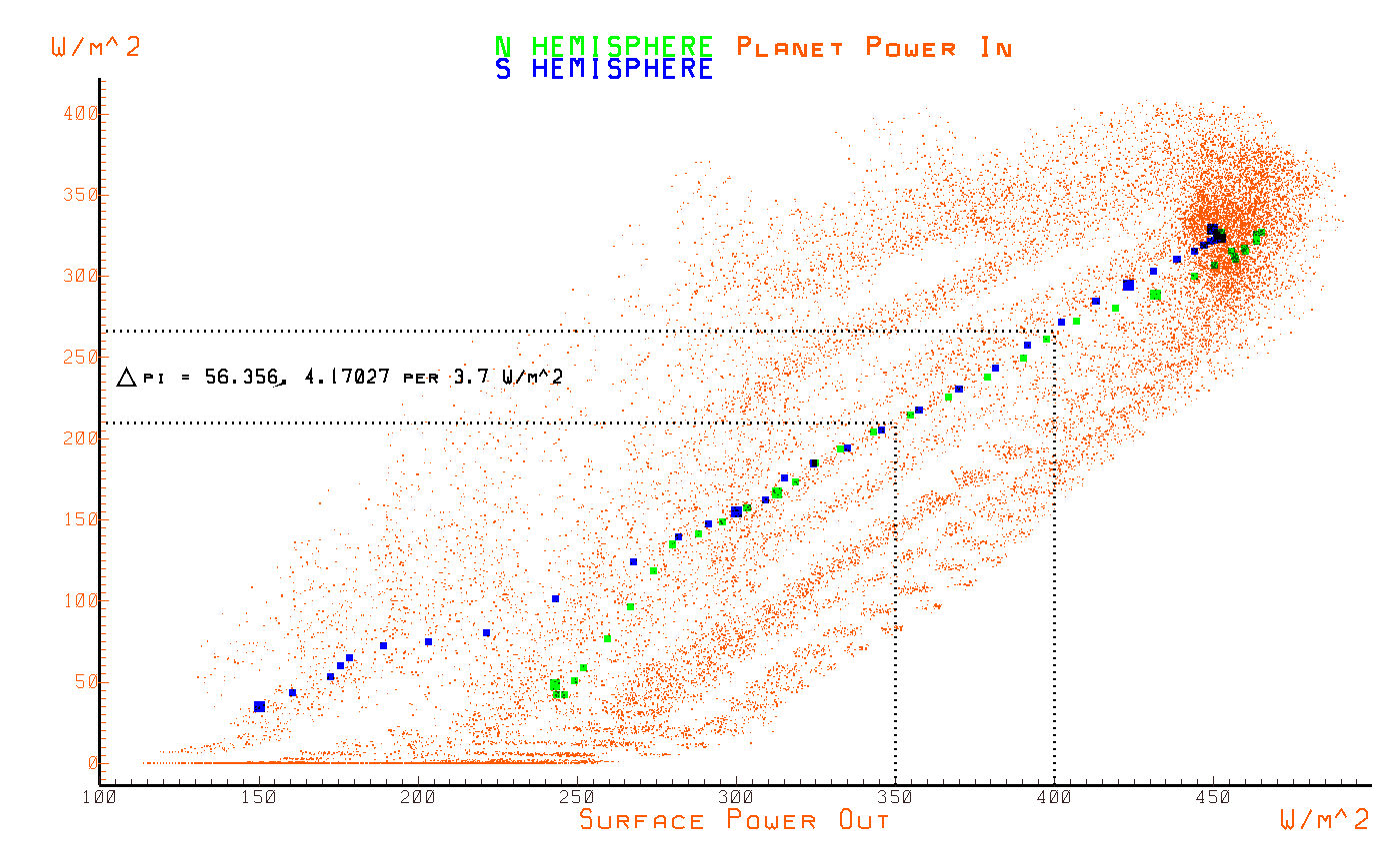 These are plots of several climate variables vs. the power emitted by the surface consequential to its temperature. The different variables plotted against SE are,